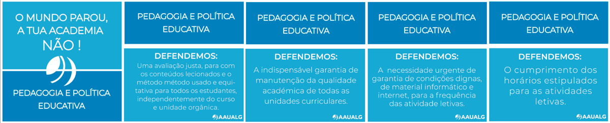 A primeira preocupação da AAUAlg foi, uma vez garantida a saúde dos estudantes, procurar mecanismos de garantia da continuidade da progressão de estudos dos mesmos. Junto da Reitoria da UAlg, diretores de Unidades Orgânicas e presidentes de Conselho Pedagógico, foi feito um trabalho árduo e contínuo de acompanhamento das alternativas encontradas, defendendo sempre os principais interesses dos alunos.
